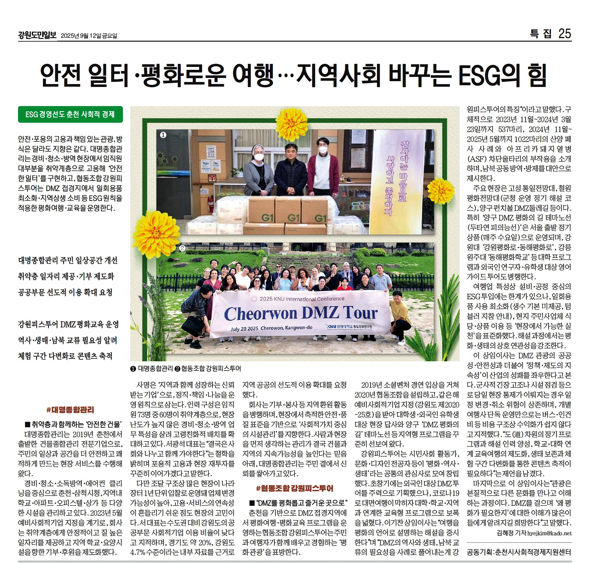 [강원도민일보] 안전 일터·평화로운 여행…지역사회 바꾸는 ESG의 힘 ((주)대명종합관리, 협동조합 강원피스투어)조회수14 2025.10.24 -