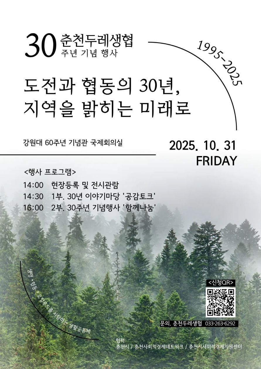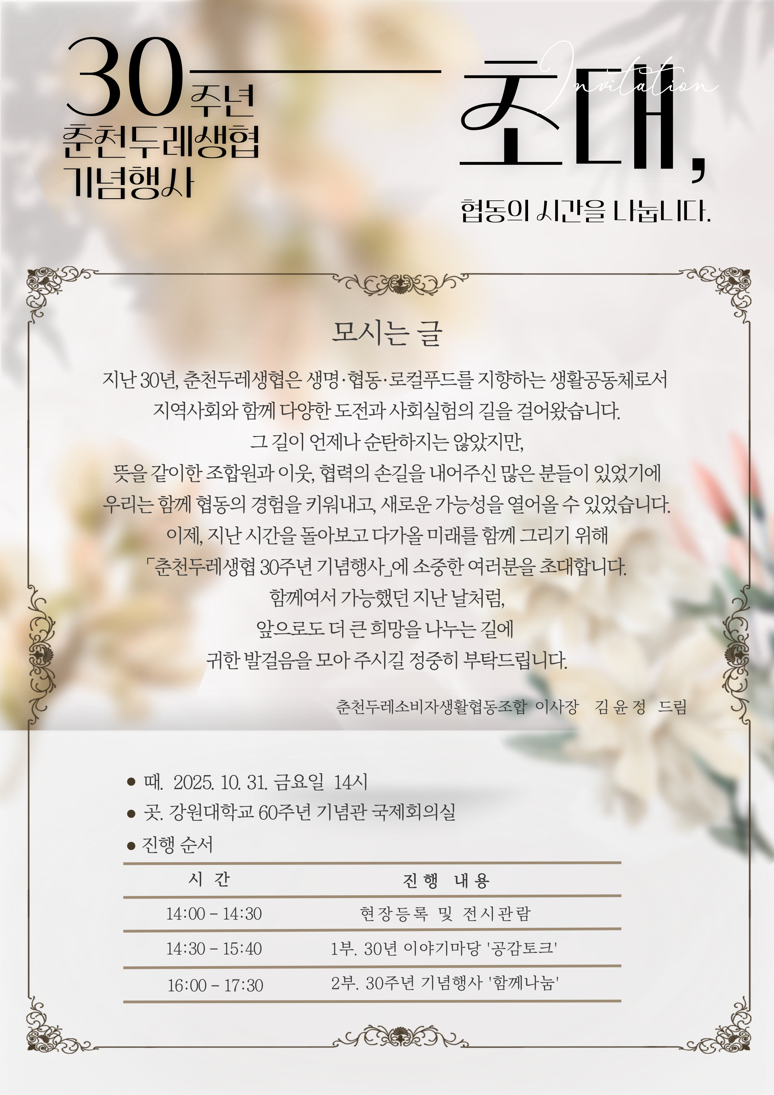 「춘천두레생협 30주년 기념행사」에 소중한 여러분을 정중히 초대합니다.