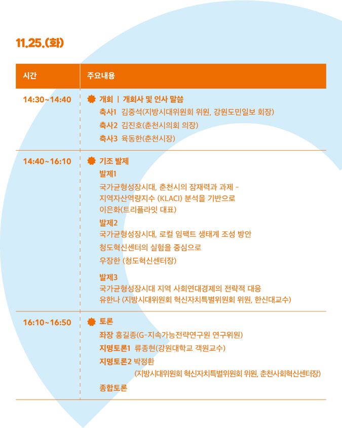 ■ 개회 : 개회사 및 인사 말씀 · 축사 1 : 김중석 ( 지방시대위원회 위원 , 강원도민일보 회장 ) · 축사 2 : 김진호 ( 춘천시의회 의장 ) · 축사 3 : 육동한 ( 춘천시장 ) |