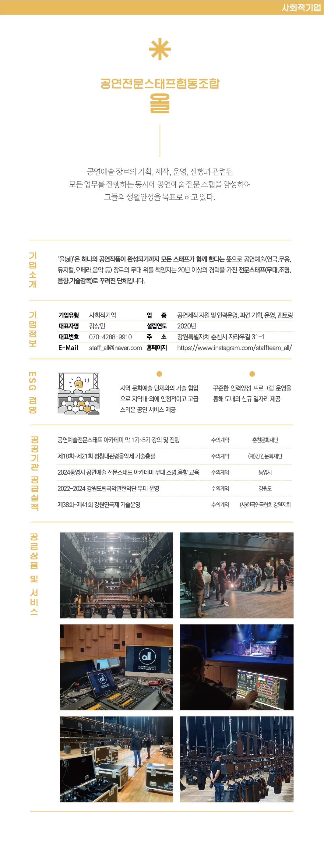 '올(all)'은 하나의 공연작품이 완성되기까지 모든 스태프가 함께 한다는 뜻으로 공연예술(연극, 무용, 뮤지컬, 오페라, 음악 등) 장르의 무대위를 책임지는 20년 이상의 경력을 가진 전문스태프(무대,조명,음향,기술감독)로 꾸려진 기업입니다